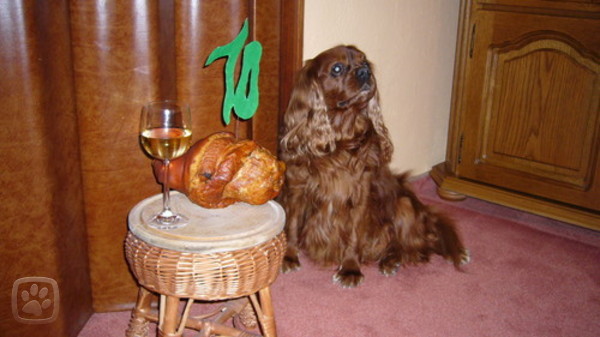 Strašně rád jedl, vždycky nám asistoval u stolu, kde měl i svou židli.. nic si nevynucoval, jen seděl a pěkně nás pozoroval.. taktně nás upozornil, že by taky rád něco dostal.. položením tlapky na stůl, sem tam mu ukápla slina.. (když bylo kuře =)